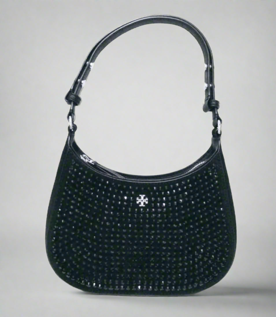 The Tory Burch Emerson Crystal Shoulder Bag is where timeless design meets glamorous detailing. Crafted in a sleek crescent silhouette, this evening-ready piece features a shimmering field of hand-set crystals on a satin or velvet base — finished with a smooth leather trim and the signature Tory Burch Double-T logo.